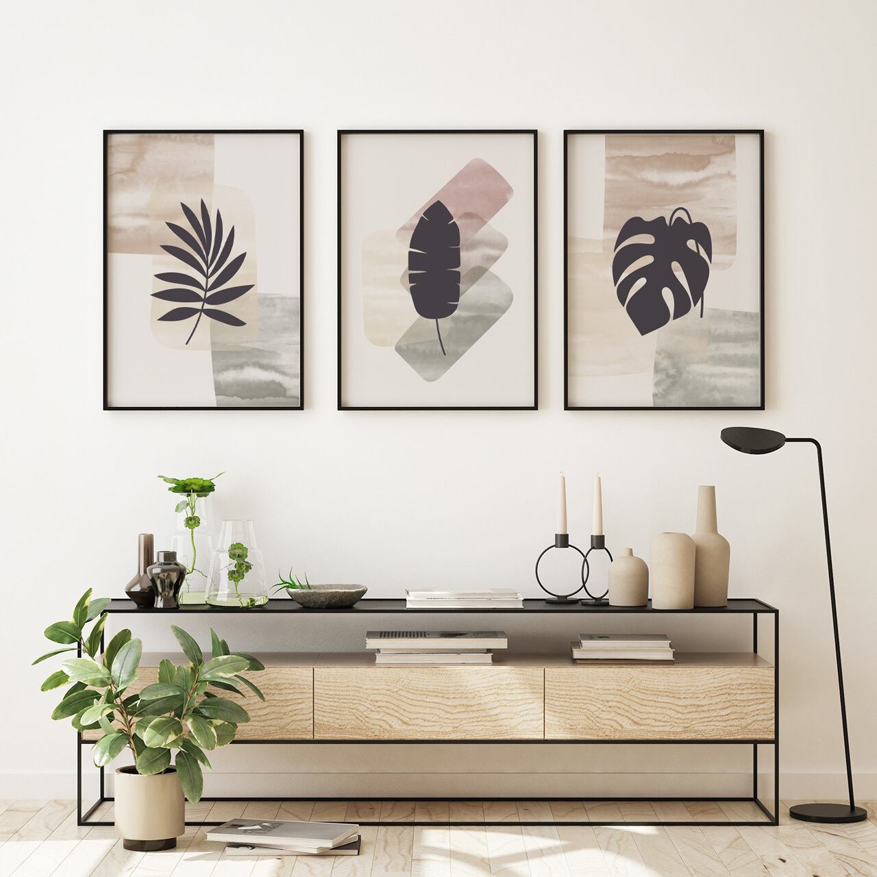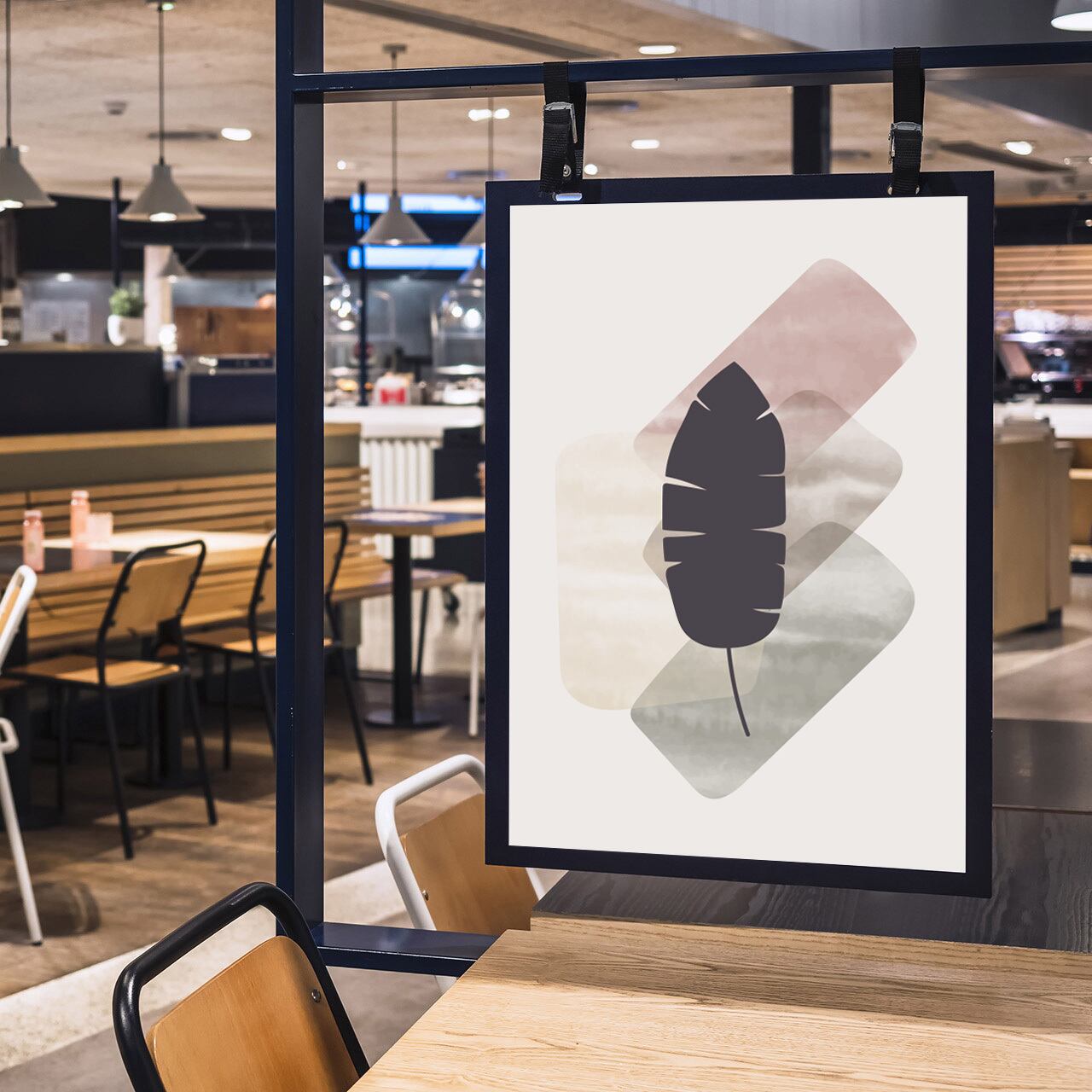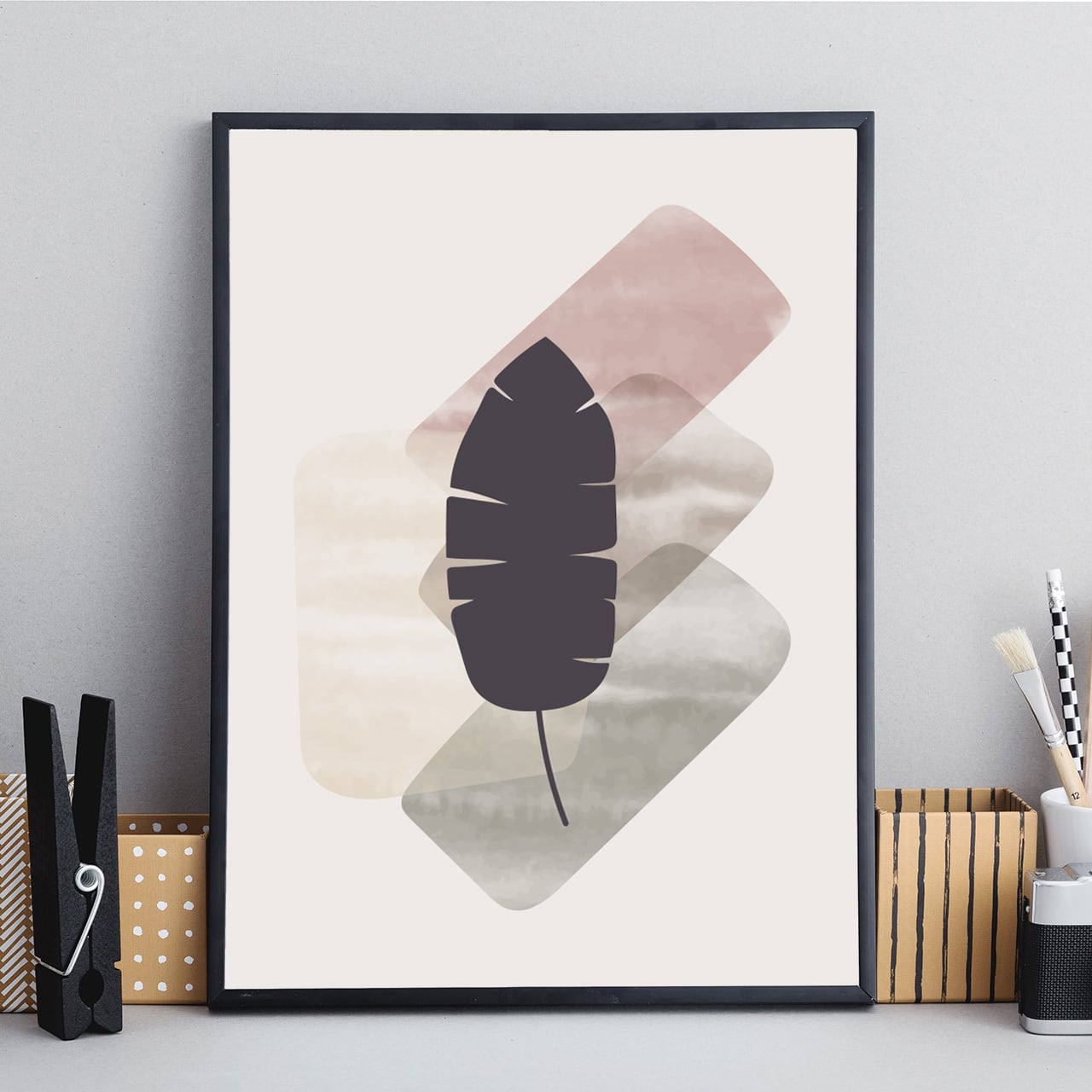 シンボリックに描かれた葉と抽象的な背景のコントラストが印象的なポスター。
